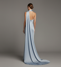 Crafted in a refreshing silver blue hue, this striking gown pairs a structured crepe bodice with a breezy, gathered chiffon skirt. The dropped waistline and asymmetrical hem bring modern edge, while the included chiffon scarf adds a soft, feminine finish. Perfect for garden parties, formal events, or golden-hour occasions.