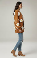 Detail: Intricate embroidered daisies, ribbed hem and cuffs, front button closure