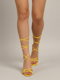 Minimalist design meets bold elegance — these stilettos feature sleek crossover straps and wrap-around ties for a striking finish.
